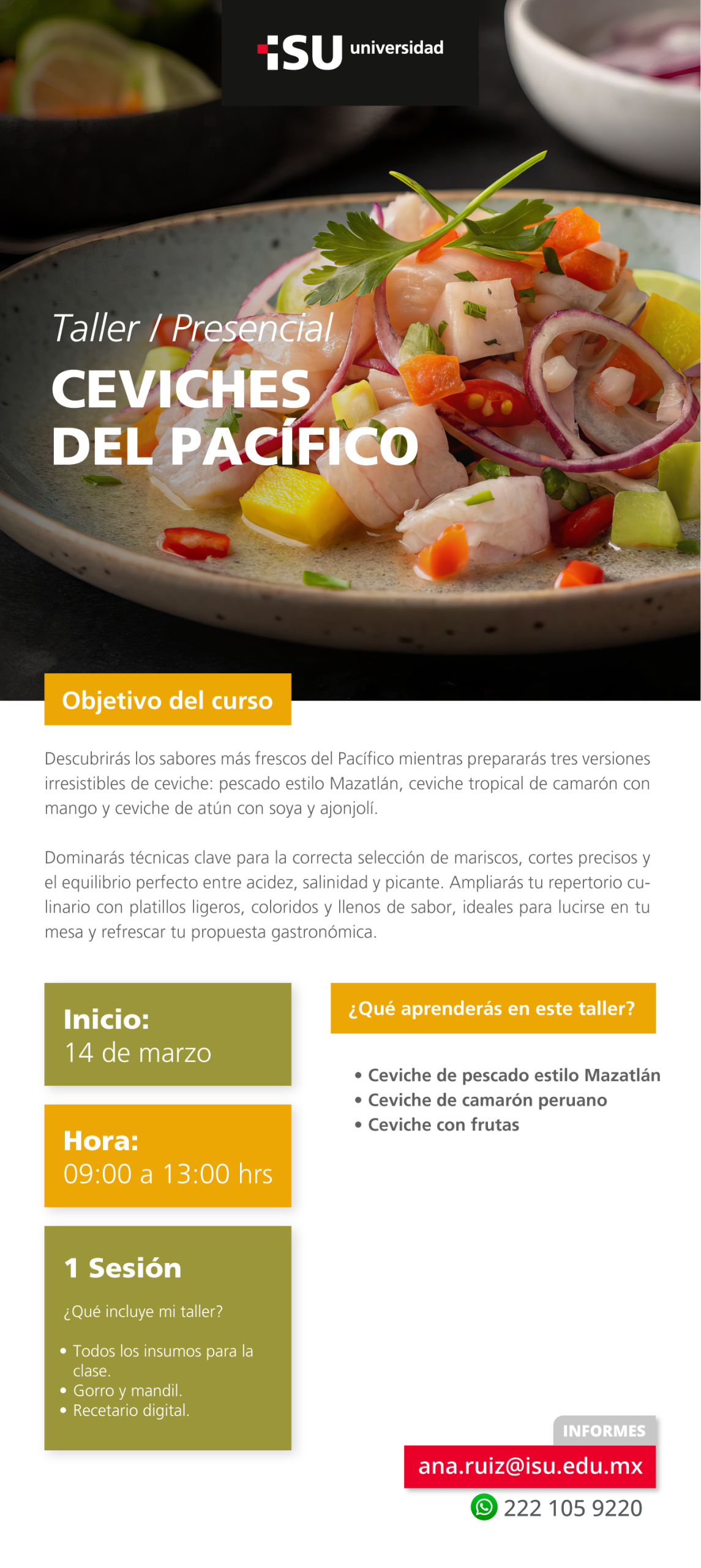 Vive una experiencia práctica donde aprenderás a preparar tres irresistibles versiones: ceviche estilo Mazatlán, ceviche tropical de camarón con mango y ceviche de atún con soya y ajonjolí, combinando tradición e innovación.