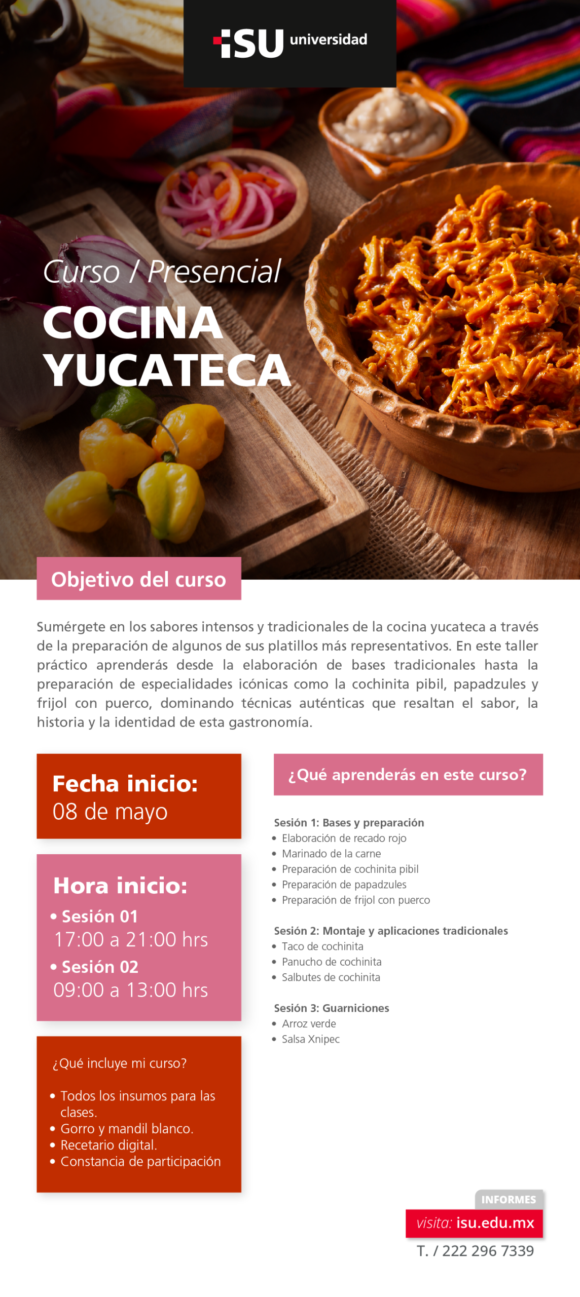Transforma tu forma de cocinar y aprende a preparar auténtica cochinita pibil y antojitos yucatecos en un taller práctico, dinámico y guiado por expertos.