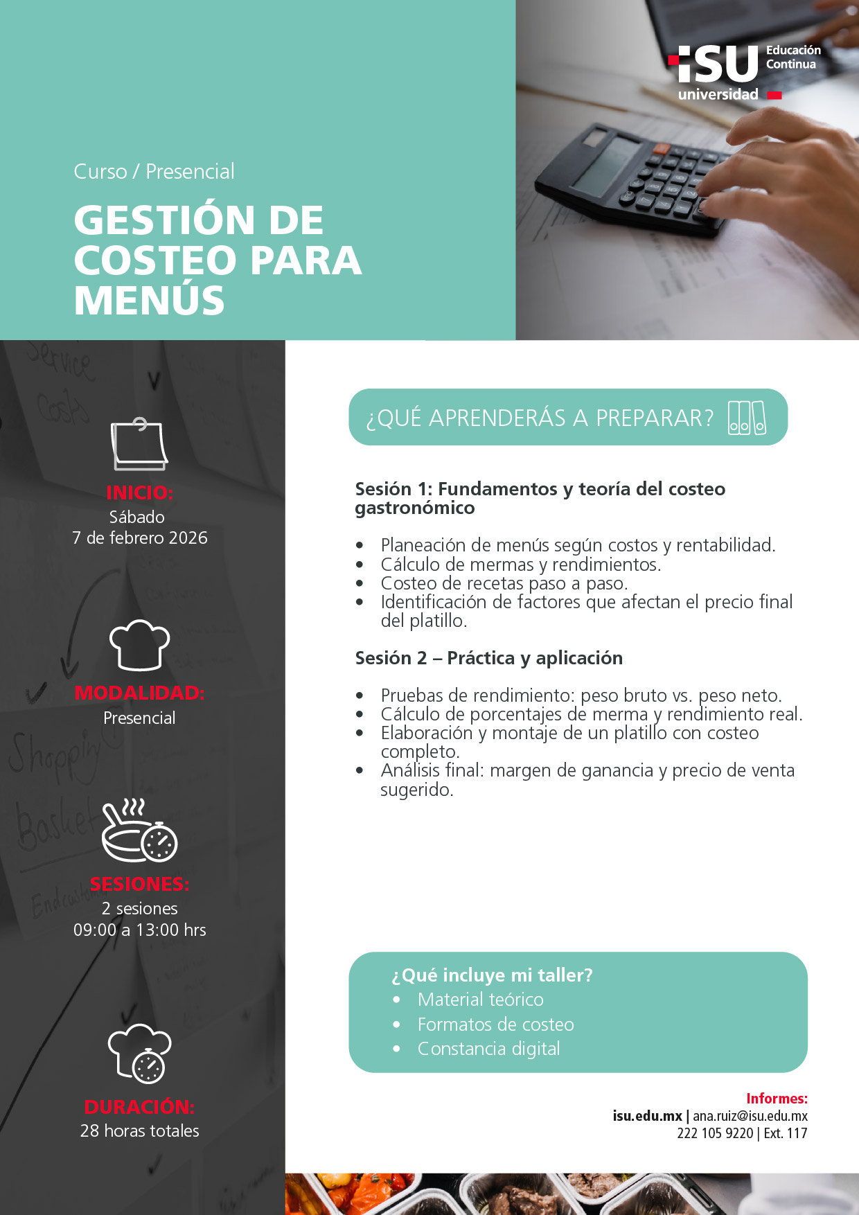 En este curso práctico de costeo de menús, descubrirás cómo obtener el costo real de cada platillo, optimizar insumos y maximizar tus ganancias sin sacrificar calidad ni sabor. Ideal para chefs, emprendedores gastronómicos y negocios de alimentos que buscan mayor rentabilidad y control.
