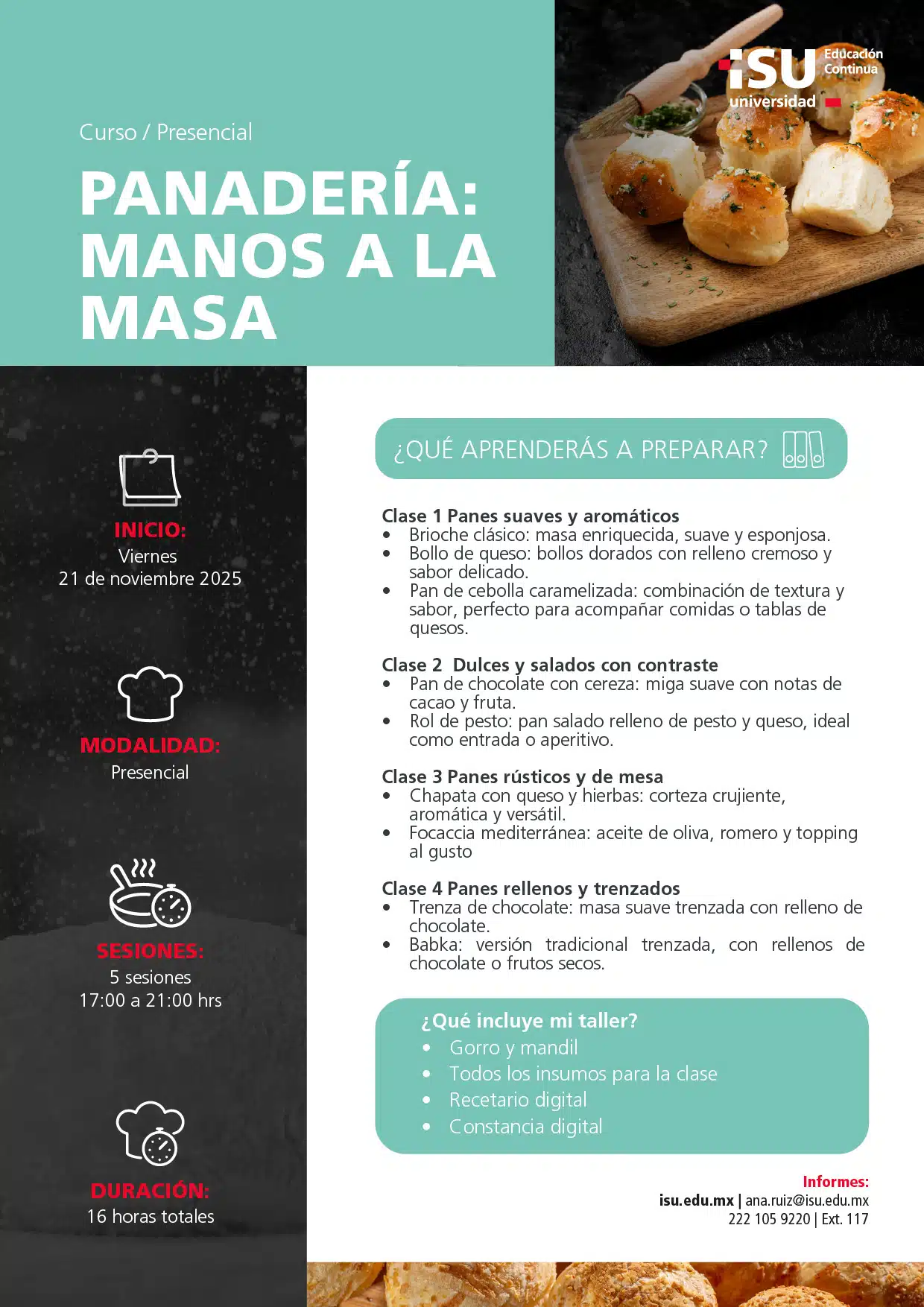Domina el arte de la panadería tradicional. Aprende a crear panes de otoño, panadería festiva, trabajar con diferentes tipos de levadura, y elaborar tu propia masa madre.