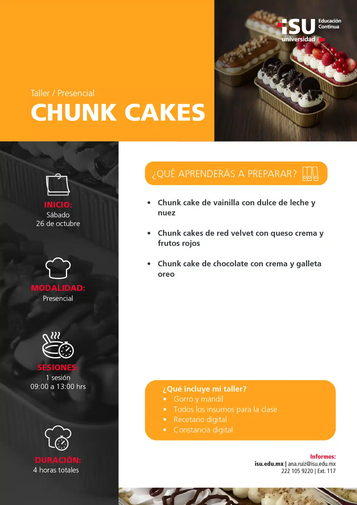 En este taller aprende a crear Chunk Cakes espectaculares, húmedos, esponjosos y repletos de trozos de chocolate, frutas y nueces. Descubre combinaciones irresistibles, glaseados perfectos y decoraciones que harán de tus pasteles una verdadera tentación.