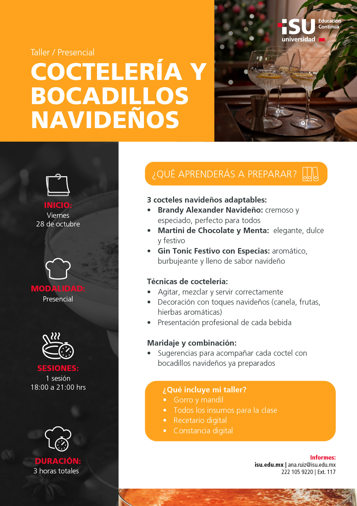 En el Taller Coctelería y Bocadillos Navideños aprenderás a preparar cocteles festivos irresistibles, desde clásicos con alcohol hasta mocktails elegantes y sin alcohol.
