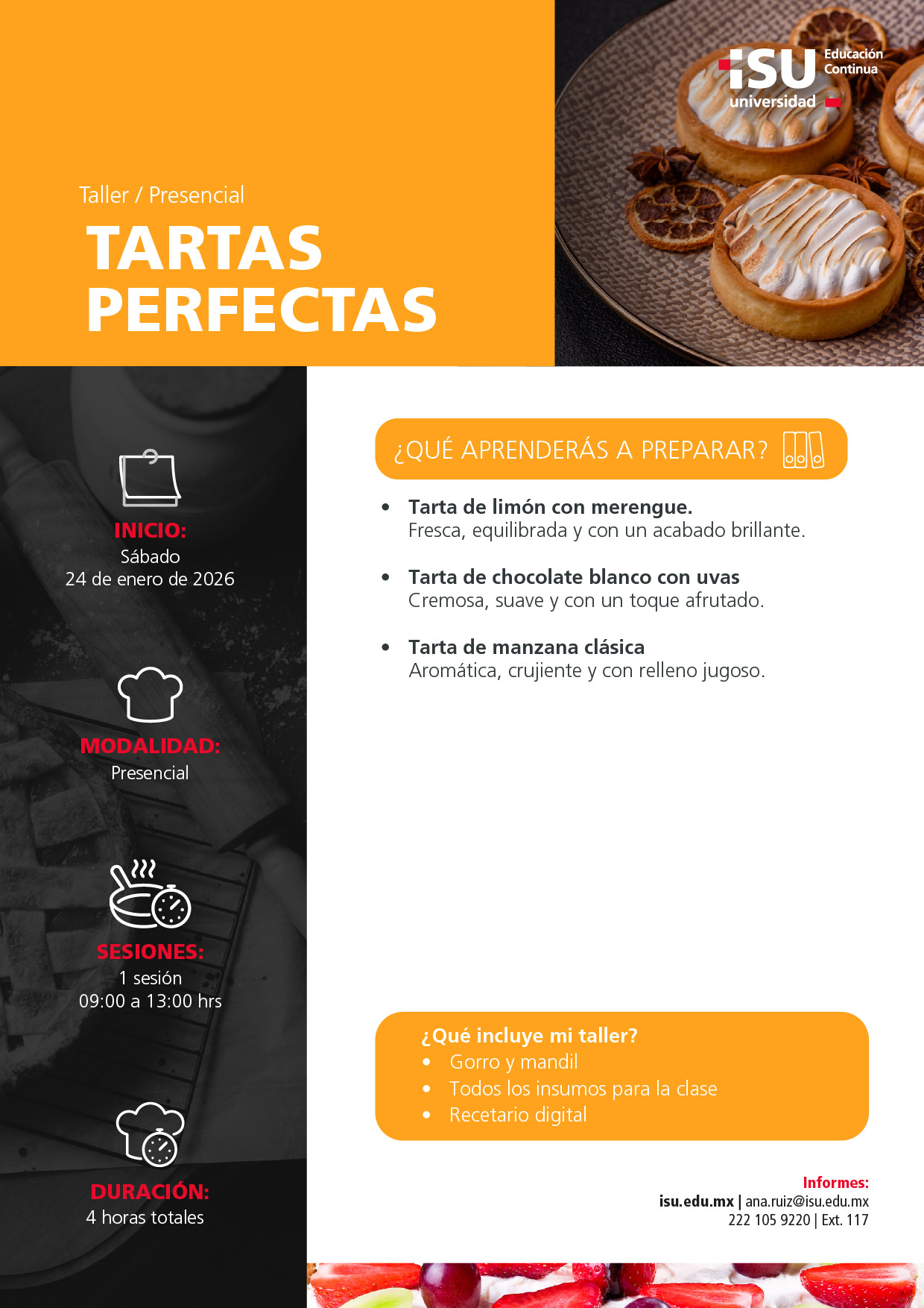 Conoce la elaboración de las tartas clásicas dulces y saladas, manejando las técnicas de repostería adecuadas aunado a los secretos de nuestro chef repostero.