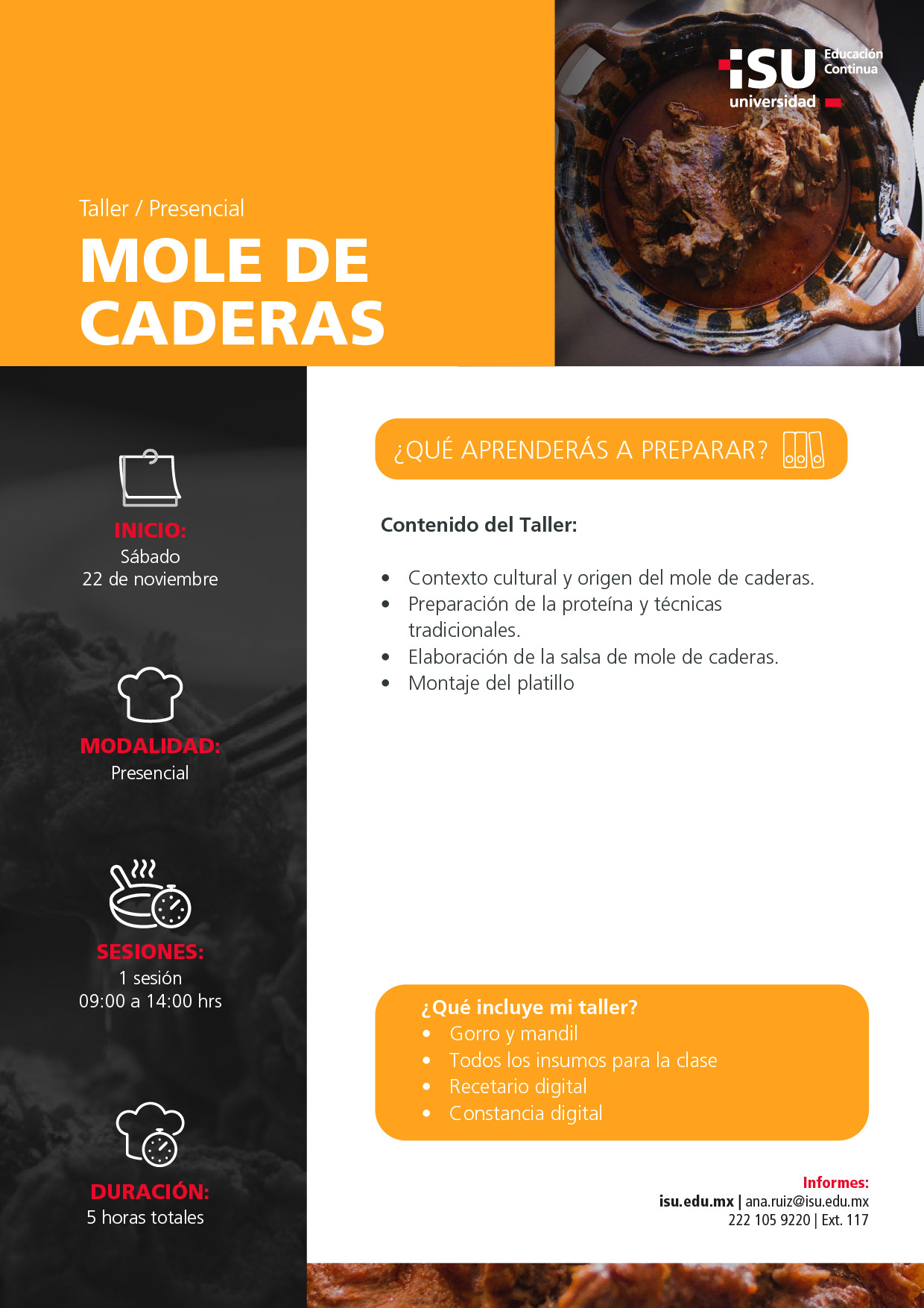 Descubre la esencia de la cocina poblana con este taller dedicado a uno de sus platillos más tradicionales. Aprende las técnicas, ingredientes y secretos que hacen del mole de caderas una verdadera joya culinaria de temporada.