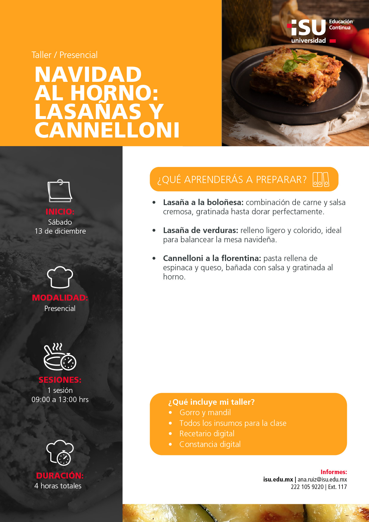 Vive una experiencia navideña llena de sabor con este taller donde aprenderás a preparar lasañas y cannellonis perfectos para tus celebraciones. Descubre el placer de cocinar platos cálidos, reconfortantes y llenos de espíritu festivo.