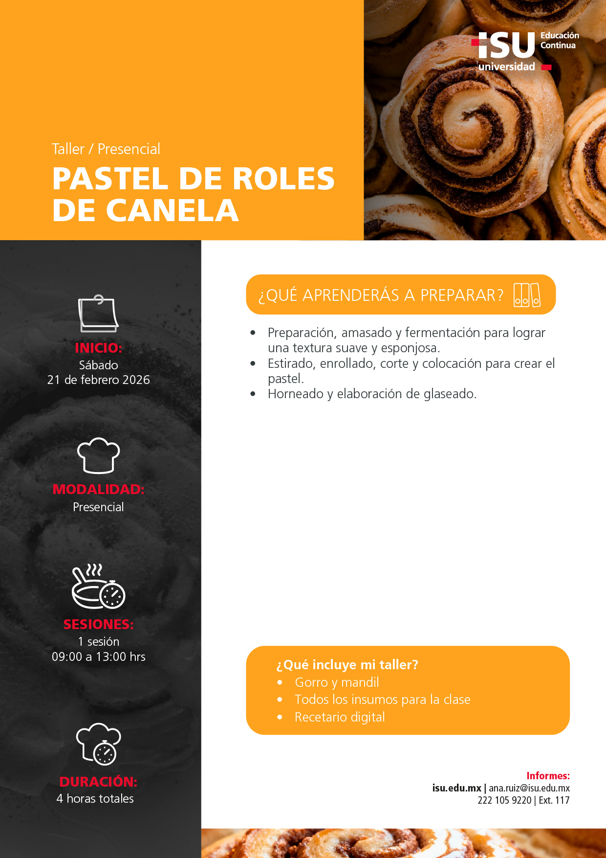Aprende a transformar los tradicionales roles de canela en un pastel, suave, aromático y con un glaseado que conquista a primera vista. Dominarás la masa, el formado, el horneado y el montaje, además de una versión salada al pesto ideal para ampliar tu oferta.