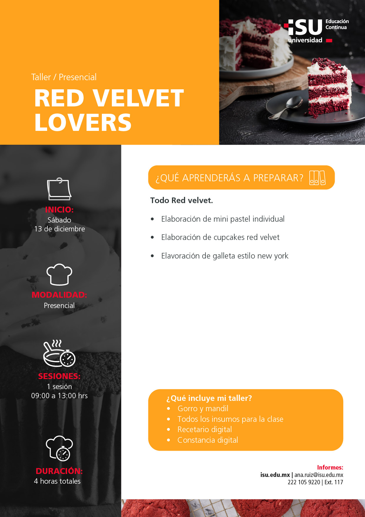 Déjate envolver por el encanto del Red Velvet y vive una experiencia única de repostería. Aprenderás técnicas profesionales mientras das rienda suelta a tu creatividad y elaboras deliciosas creaciones con tus propias manos.