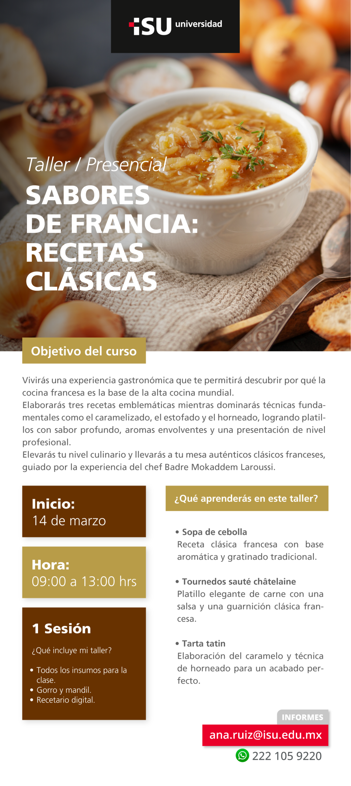 Al finalizar el taller, el participante elaborará recetas emblemáticas de la cocina francesa aplicando correctamente técnicas de caramelizado, estofado y horneado, logrando platillos con sabor, textura y presentación profesional, fortaleciendo así sus competencias en alta cocina y ampliando su propuesta gastronómica con fundamentos clásicos.