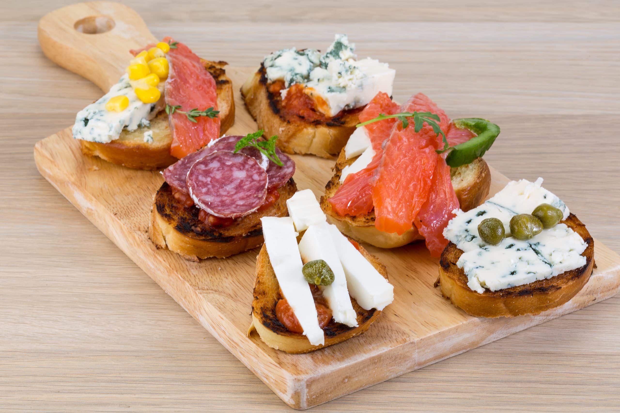 • Tapas de no–queso feta con salmón ahumado (el no queso se elabora desde cero)