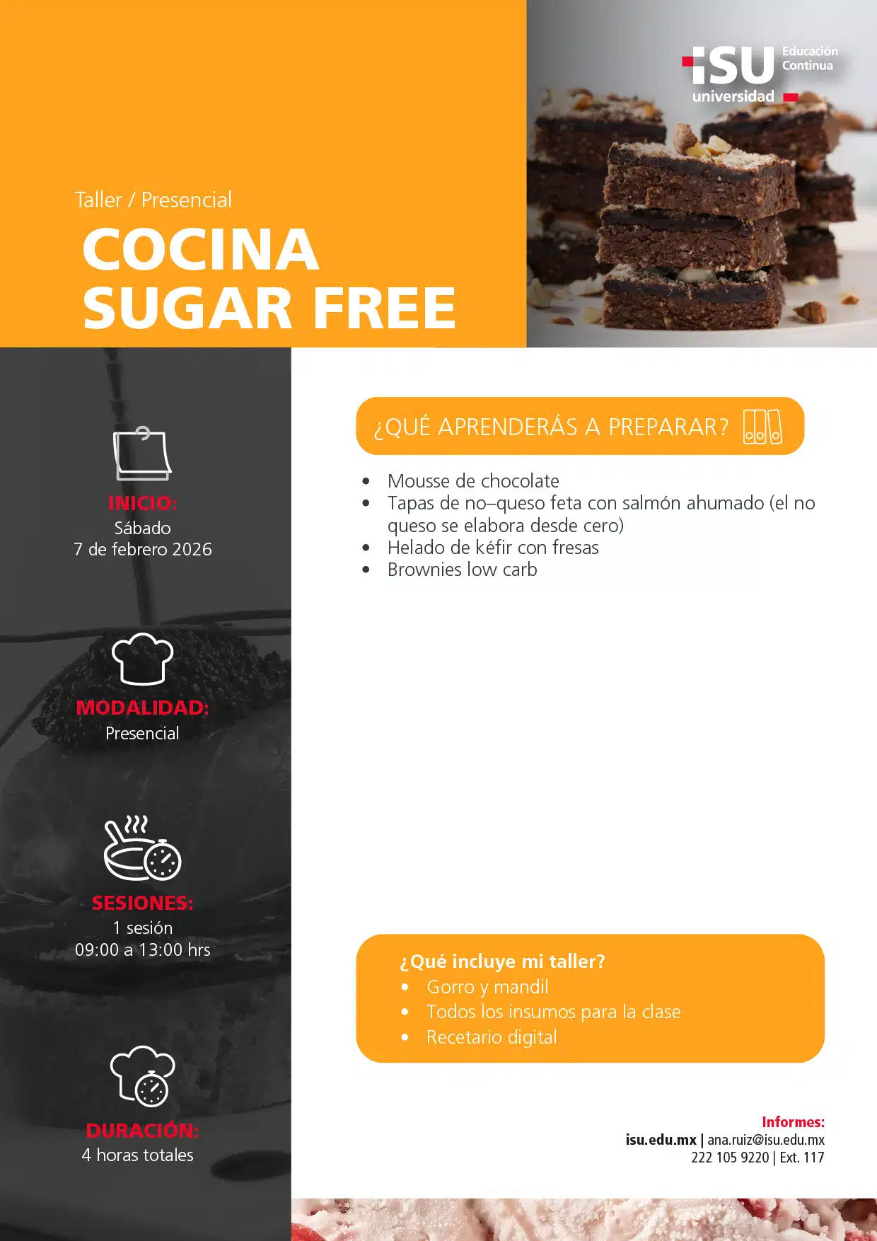 Aprende a crear postres y platillos sugar free utilizando técnicas profesionales que conservan el sabor, la textura y el equilibrio en cada preparación. En este taller práctico descubrirás cómo sustituir el azúcar de forma inteligente mediante el uso adecuado de endulzantes alternativos, logrando resultados cremosos, bien estructurados y visualmente atractivos.
